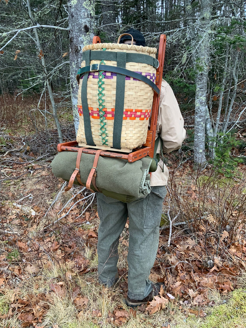Here is the new pack basket attached to the 1860’s pack frame that I made out of red oak.